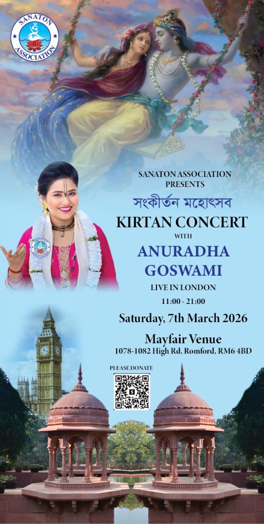 Sanaton Association’s Kirtan will be held on 7th March 2026 from 11am to 9pm with special guest, Anuradha Goswami!